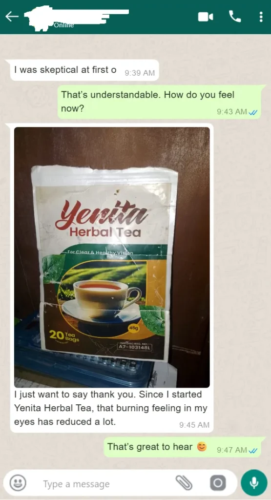 “I was so scared when my vision started getting blurry. My doctor said I was developing cataract. After using Yenita for just 6 days, the cloudiness reduced! Now after 3 weeks, my eyes are clear again. This product is real”